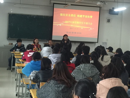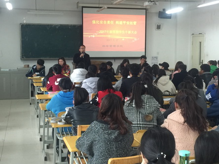 2017年3月17日中午,社会管理公司在1-504教室召开了主题为“强化安全责任 构建平安社管”员工干部大会,各班班干部、安全信息员、各宿舍舍长130余人以及副经理石光乾、何国萍,分团委书记姜田老师、学工办张婷老师参加大会。