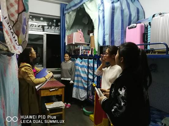 11月9日下午六点四十,宿舍卫生检查正式开始,生活部首先来到了五号女生宿舍。各个宿舍通风良好,空气清新。宿舍内物品摆放整齐,生活部的同学认真负责的检查屋内电线电路,并询问宿舍同学关于安全生活中需要掌握的基本知识。同学们对宿舍检查都很重视,也很配合。