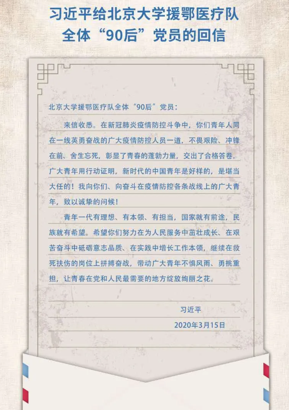 为了积极响应习近平总书记关于疫情防控的号召,做有理想、有本领、有担当的新时代青年,体育平台官网全体员工党员于3月17日认真学习了习近平总书记给北京大学援鄂医疗队全体“90后”党员的重要回信精神。在学习回信精神后,体育平台官网全体员工党员分享了自己的学习心得。