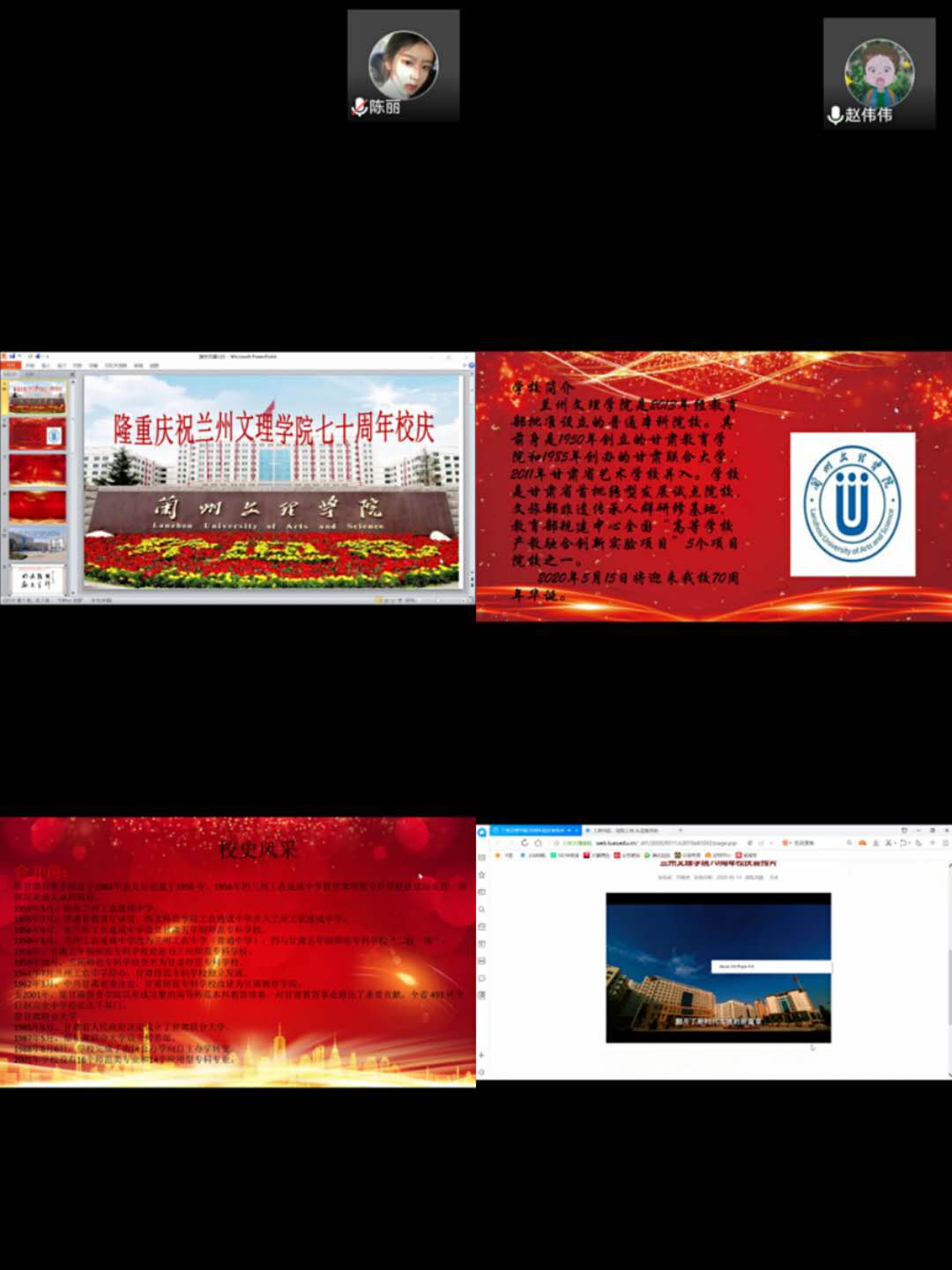 2020年5月15日,体育平台官网迎来了建校七十周年华诞。为响应疫情防控工作需要,应公司决定将校庆活动转至线上展开的要求,于2020年5月15日12点10分,体育平台官网员工会在腾讯会议开展活动。活动由赵伟伟主持。