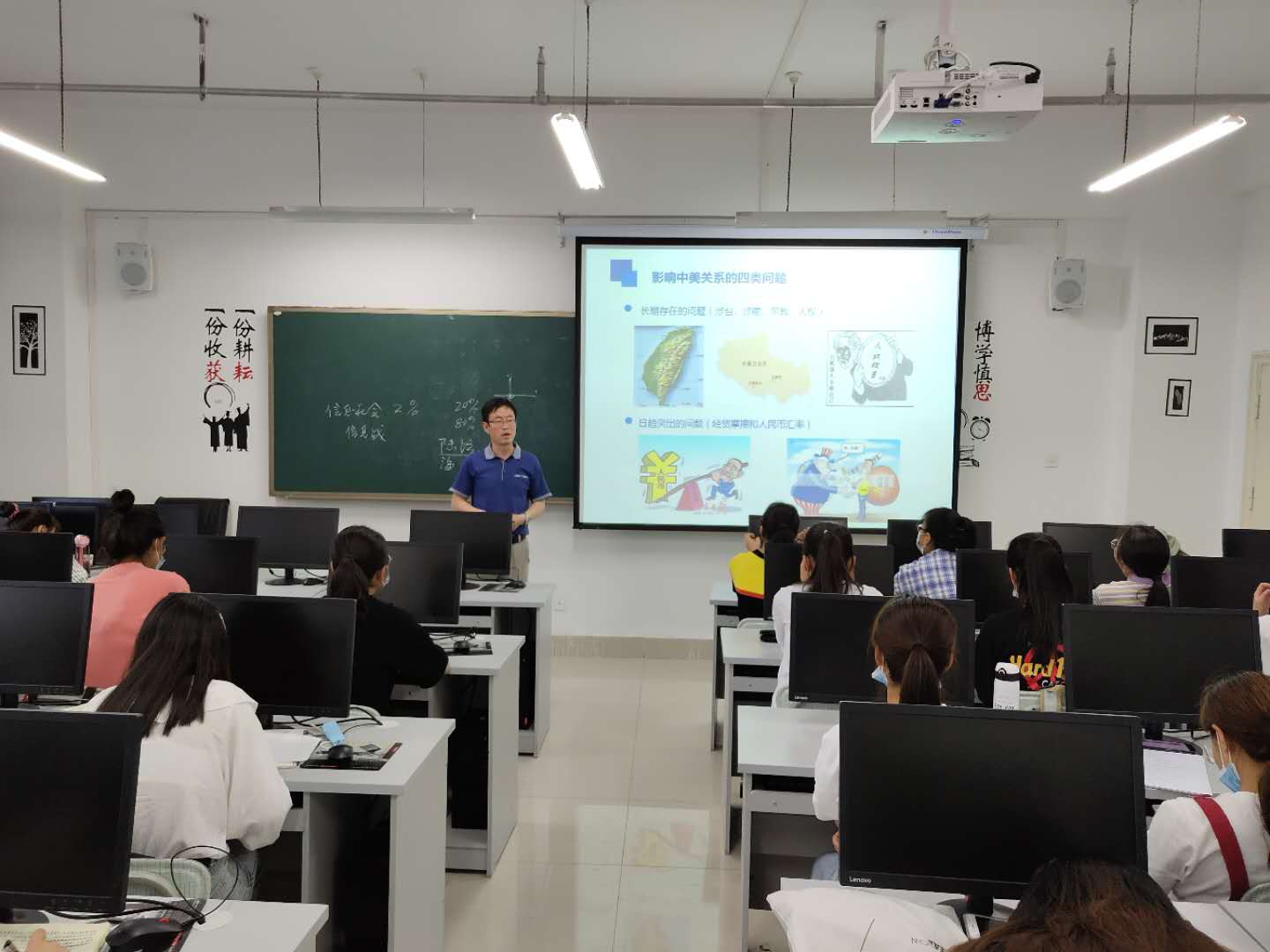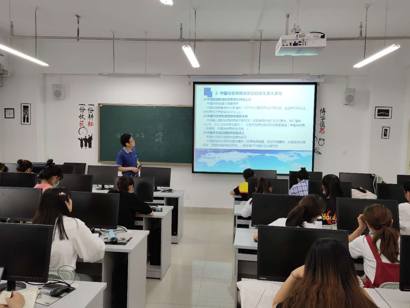 此次实训的主要内容是关于习近平的外交思想及中国的外交战略,让同学们对现如今的形势与政策有深入的了解。本次学习通过对中国目前外交形势的特征、中国与世界关系发生重大变化等方面的讲解,透彻、清晰的分析了中国的综合国力、中国与世界的联系、周边关系的发展与存在的问题、国家安全等时政。同学们对实训内容表现出高度热情,并认真聆听,收益颇丰。