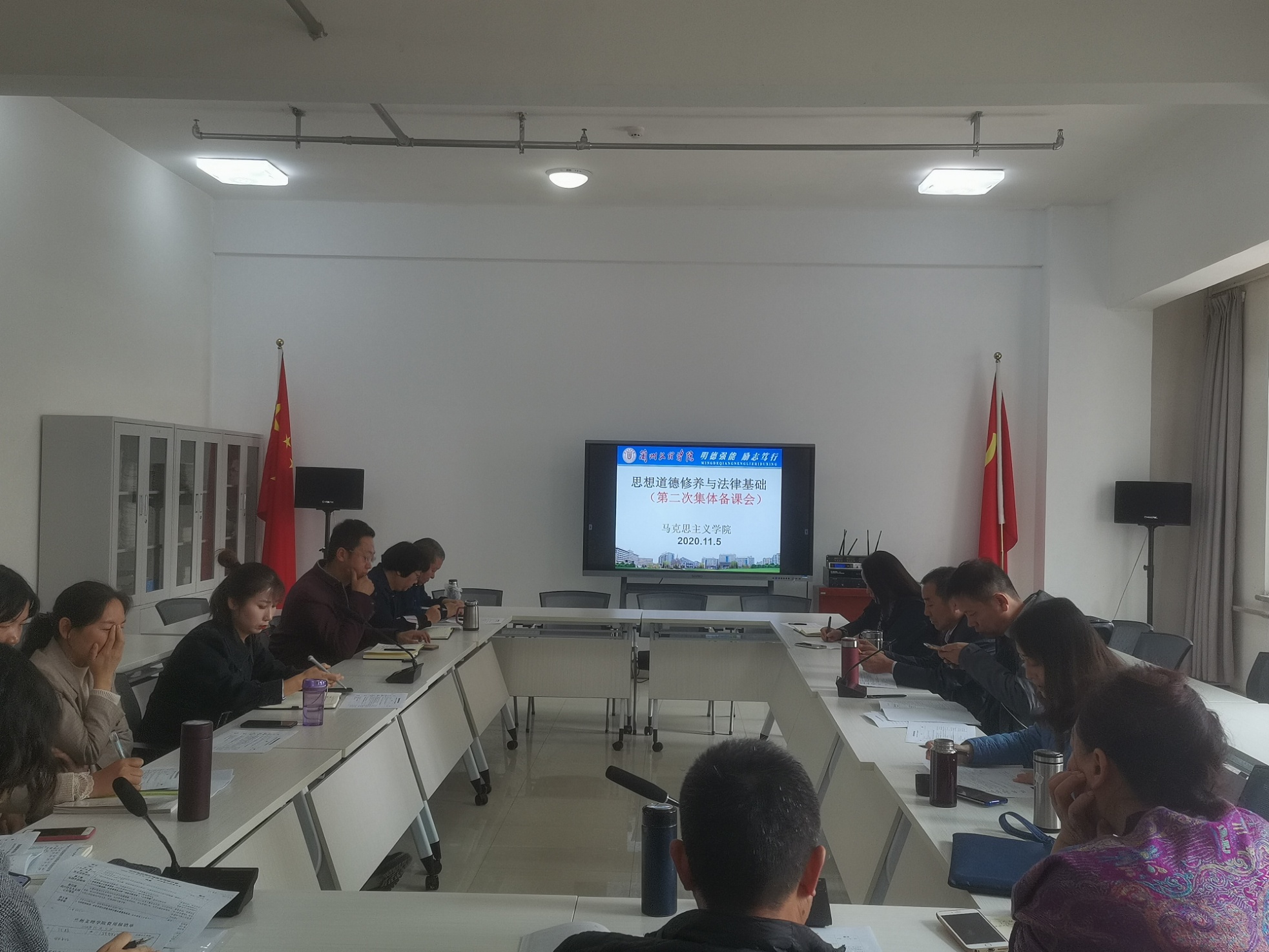 为深入贯彻落实习近平新时代中国特色社会主义思想和党的十九大精神,贯彻落实习近平总书记关于教育的重要论述,特别是在公司思想政治理论课教师座谈会上的重要讲话精神,全面贯彻中共中央办公厅国务院办公厅《关于深化新时代公司思想政治理论课改革创新的若干意见》,坚持不懈推动思想政治理论课改革创新,不断增强思想政治理论课的思想性、理论性和亲和力、针对性,根据《体育平台官网教师集体备课制度》的规定,2020年11月5日下午,思想道德修养与法律基础教研室在公司会议室举行本学期第二次集体备课会。本次会议由教研室主任沙莉老师主持,曾令琼教授、巩英洲教授等十四位教师参加了本次备课会。本次会议主要就公司《思想道德修养与法律基础》课程实践教学安排计划进行了讨论,旨在贯彻落实思想政治理论课立德树人的根本任务。