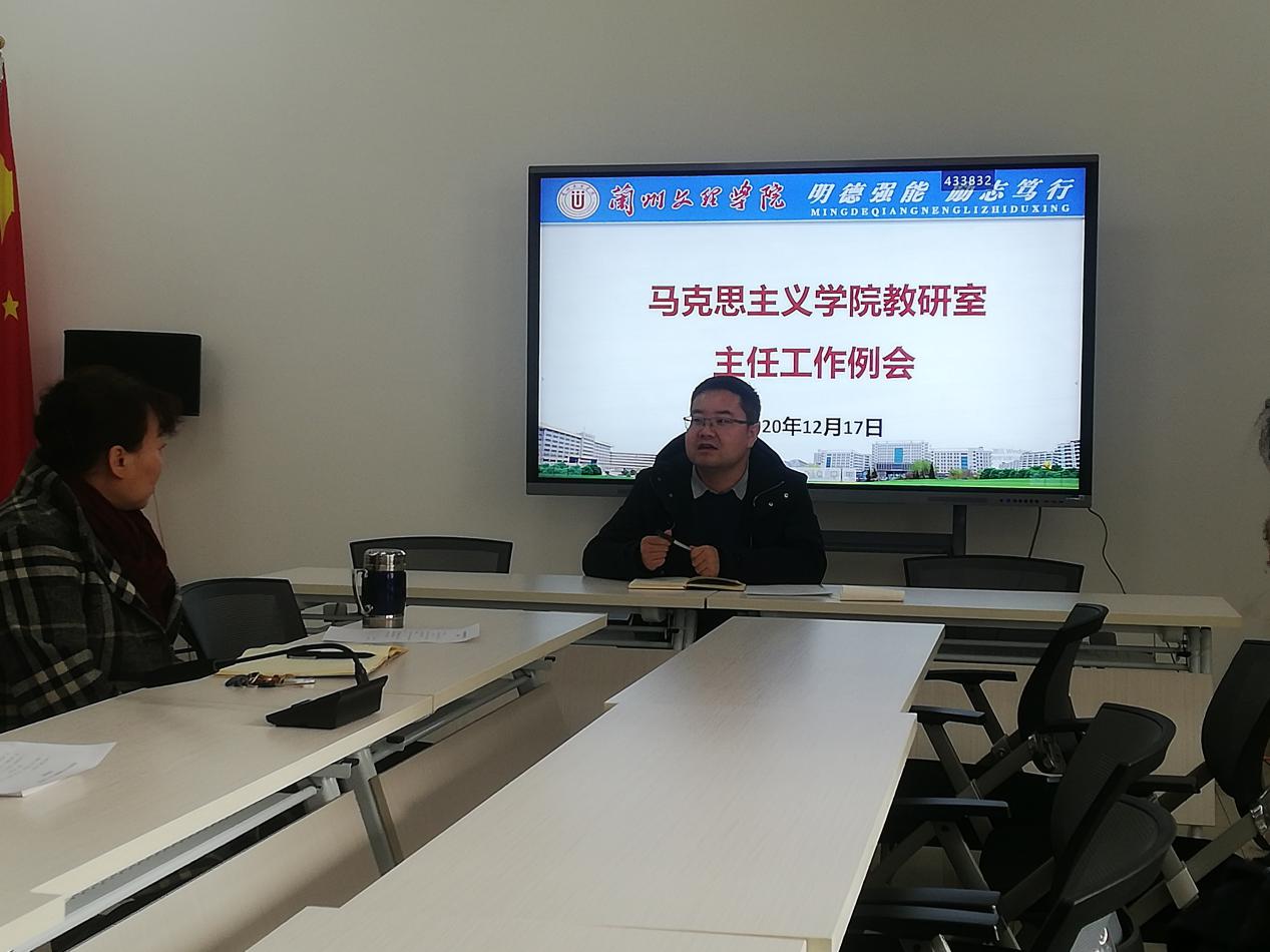 蒋海蛟通报了学期末教学检查情况,对近期的听课结果进行了反馈,要求各教研室主任督促任课教师狠抓教学质量、保证教学进度,在学期末保质保量完成教学任务,同时对期末考试命题工作提出了要求。根据下学期教学计划,蒋海蛟对《马克思主义基本原理概论》和《毛泽东思想和中国特色社会主义理论体系概论》两门课的开班情况提出了建议和要求。各位教研室主任对学期末教研室工作和下学期开课计划做了交流汇报,对期末命题工作、“我也来上思政课”比赛活动等进行了交流探讨。