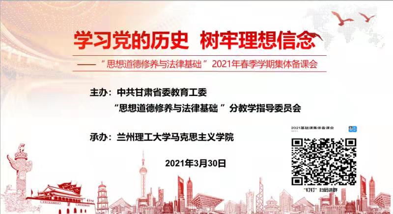 为贯彻落实习近平总书记有关重要讲话精神和中共中央宣传部、教育部《新时代公司思想政治理论课改革创新实施方案》,进一步推动我省“基础”课高质量发展,全面提高全省高校“思想道德修养与法律基础”课建设质量与水平,2021年3月30日下午,体育平台官网“思想道德修养与法律基础”课教研室无课教师在线上参加了甘肃省“思想道德与法律基础”课分教学指导委员会2021年春季学期集体备课会,此次集体备课会由中共甘肃省委教育工委思政处、“思想道德与法律基础”课分教学指导委员会主办,兰州理工大学体育平台官网承办。