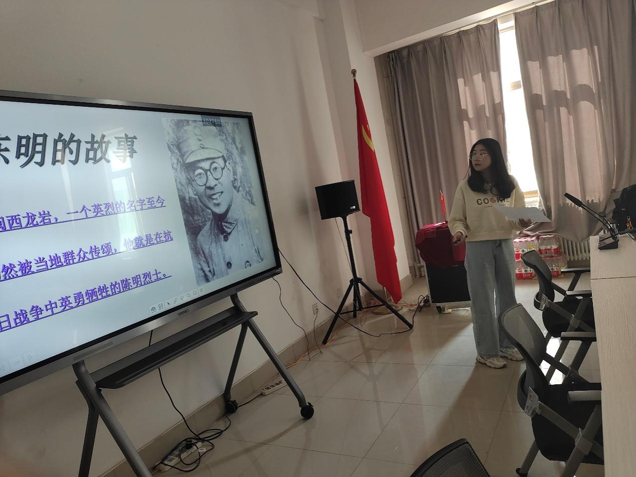 在革命故事分享环节,谢瑶同学为大家讲解了革命烈士陈明同志的故事,谢瑶以“回望初心,致敬先烈”为主题,围绕陈明同志的一生经历展现了陈明不惧牺牲的英勇精神无论是在革命年代还是战争时代,陈明烈士能够不忘初心,拥有信仰,为国家做贡献。从谢瑶同学的分享中,我们学到了无论时代如何变迁,我们应当坚信共产主义信念,不忘初心,牢记使命