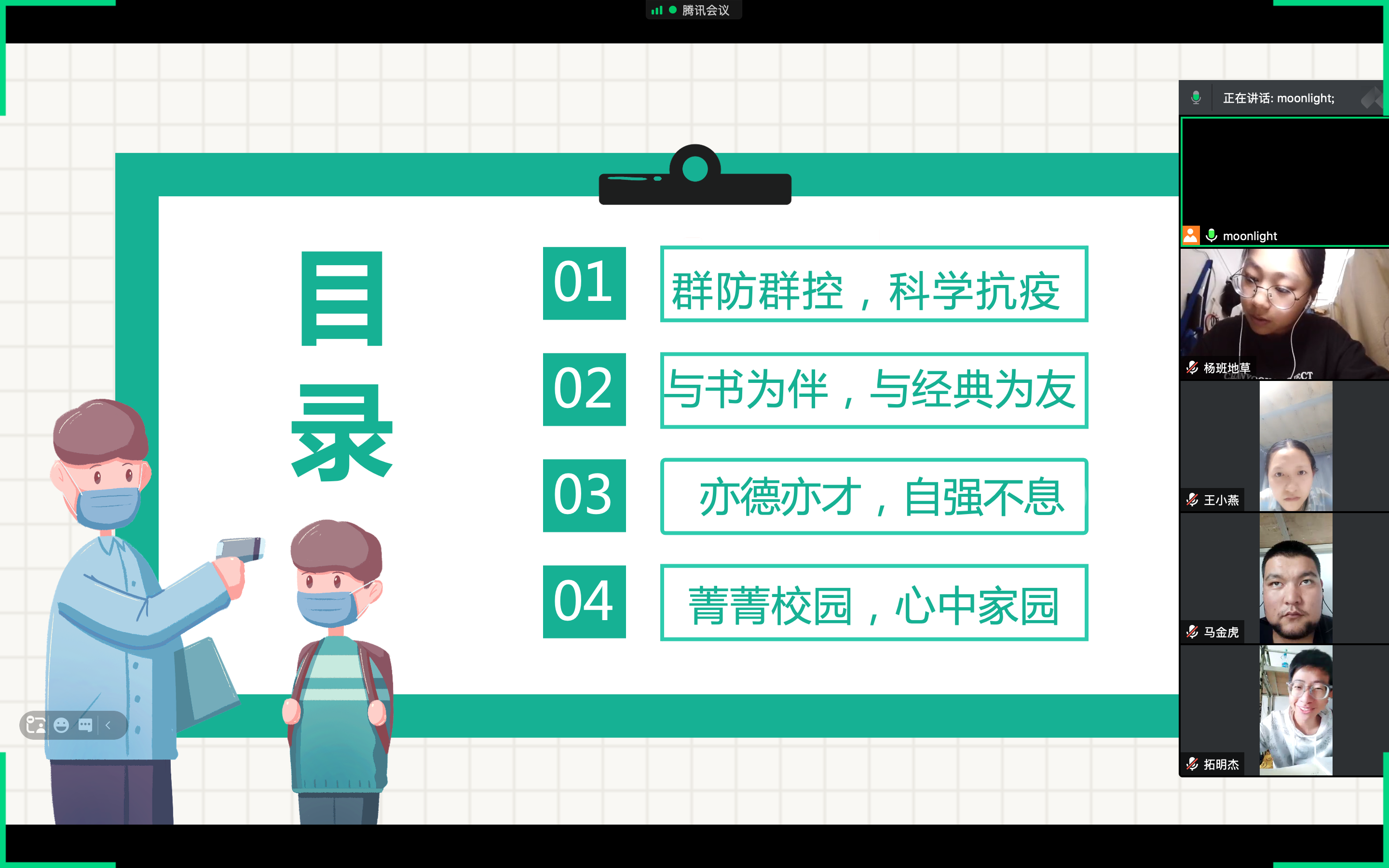 最后,班主任随机选取两名同学畅谈大学感想以及对班级建设意见,刘宁宁和马梅英两位同学向大家分享了他们的入学感受以及对班级、老师、同学们表示了感谢,并对疫情防护提出了一些建设性意见。班主任激励大家大家要不忘初心,牢记使命,坚定信心,团结一致,同舟共济,科学防控,从你我做起,共同打赢这场疫情防控狙击战。