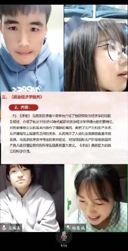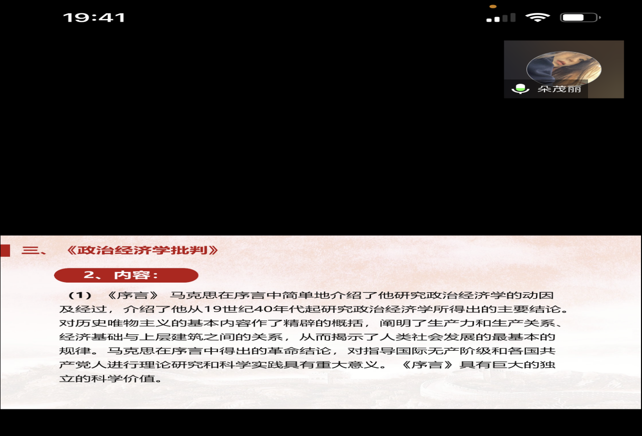 首先,以宿舍为单位选取代表发言,第一位朵茂丽同学分享书目为《政治经济学批判》,围绕这本书创作的时代背景为我们宏观讲解了《序言》的具体思想内容,对意识形态的概念分享了自己独特的见解认识,并且在分享过程中也采取了随机提问的环节,增加了活动的趣味性,也让读书会氛围变得更加轻松愉悦。