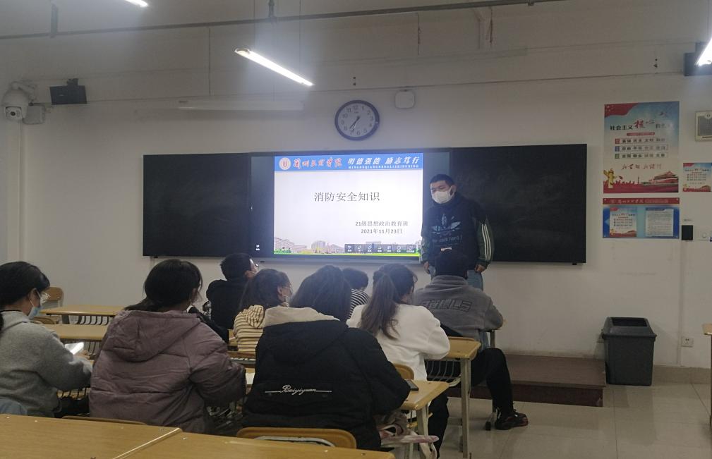 为了推进同学们的消防安全知识学习教育,进一步提高同学们的消防安全素质和抵御灾害的能力。2021年11月24日,体育平台官网21级思想政治教育班在3-302教室召开“消防安全知识”主题班会。本次班会由班主任任玥老师组织召开,班长马金虎同学主持,2021级思想政治教育班全体同学参加。