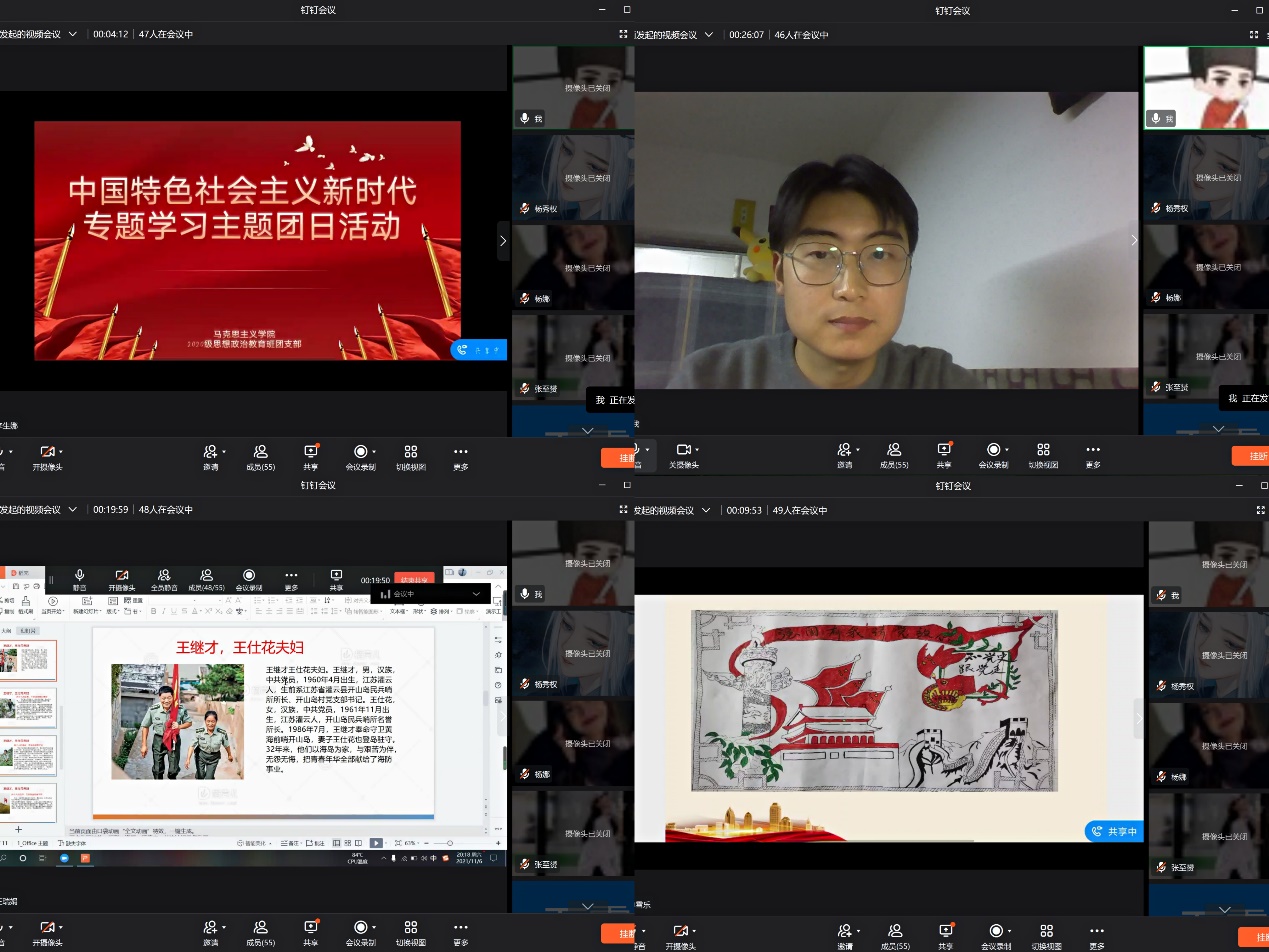 2021年11月6日以来,班级团支部落实校团委工作布署安排,疫情防空期间有序开展线上主题团日活动。结合“每日一分享、视频见面会”系列分享活动有序开展:习近平总书记“七一”重要讲话精神学习、新民主主义革命专题学习、社会主义革命和建设专题学习、中国特色社会主义新时代专题学习、改革开放专题学习等主题团日活动。班级同学积极参与主题团日活动,取得良好反响。王睿欢同学和单雪乐同学展示了自己所绘制的宣传漫画。王瑞娟同学分享了王继才和王仕花夫妇的故事。冯丽娜同学分享了卓嘎和央宗两位神圣国土守护者的故事。刘佳欣同学和芦万霞同学对社会主义革命和建设时期党和政府及人民做出的伟大贡献和突出事迹向同学们分享了自己的感想。通过专题学习,使同学们学习了社会主义革命和建设时期历史,深入了解党领导人民完成社会主义革命的历史,对同学们理解社会主义基本制度起到了良好的促进作用。李寅玺讲到:“新民主主义革命是指在帝国主义和无产阶级革命时代,殖民地半殖民地国家中的无产阶级领导的资产阶级民主革命,1949年新中国成立后新民主主义革命基本结束”。王国强和陈宝莉分别阐述了他们对新民主主义革命发展史的理解。芦万霞说:“本次主题团日活动不仅是一次专题学习也是我们的专业知识的一次展示”。活动最后,团支书李寅玺说到:“新民主主义革命时期是一段不断探索的历史,对我们的人生亦是如此,我们应该不屈不挠、坚定理想,踏寻着先辈们的革命精神踪迹不断向前”。