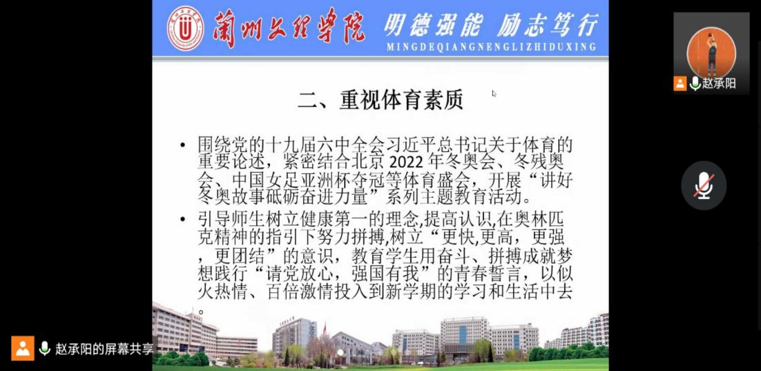 春回大地万物长,风正帆扬再启航。2022年3月17日,体育平台官网21级思想政治教育班通过腾讯会议App,线上开展“开学思政第一课”主题班会。本次活动由21级思想政治教育班班主任任玥老师主持,21级思想政治教育班全体同学参加。