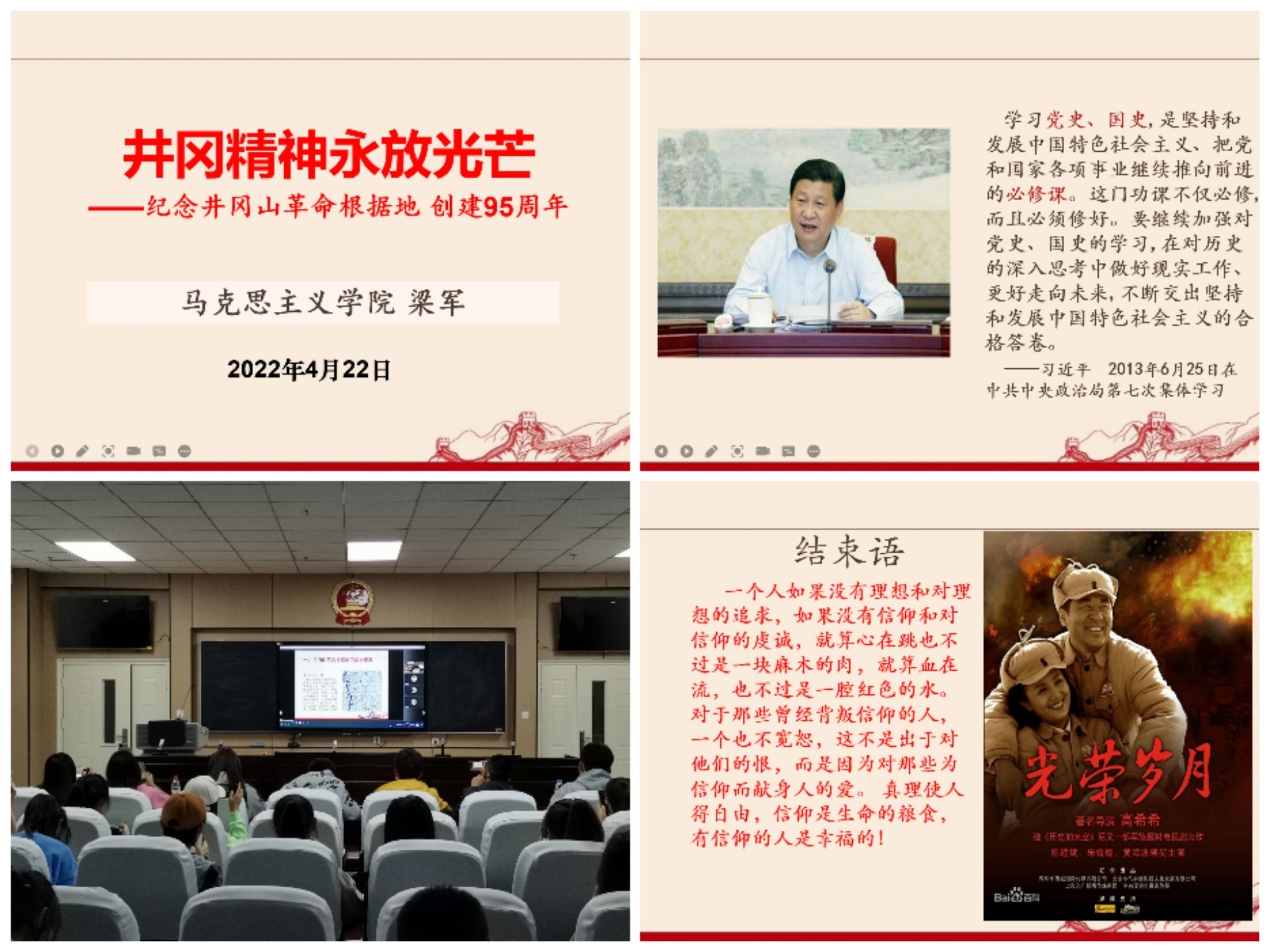 4月22日晚,培训课开讲第五课,主题是《井冈精神永放光芒》。由体育平台官网梁军副教授线上讲授。梁军老师从井冈山革命根据地的基本情况、历史划分、毛泽东“上山”的实践以及弘扬井冈山精神,坚定理想信念四个方面展开。井冈山精神是党创造的一种革命精神。诞生于土地革命时期的井冈山根据地,是引导中国革命走向胜利的宝贵精神。最后,梁军以影视作品《光荣岁月》中的台词作为结语,与大家共勉。