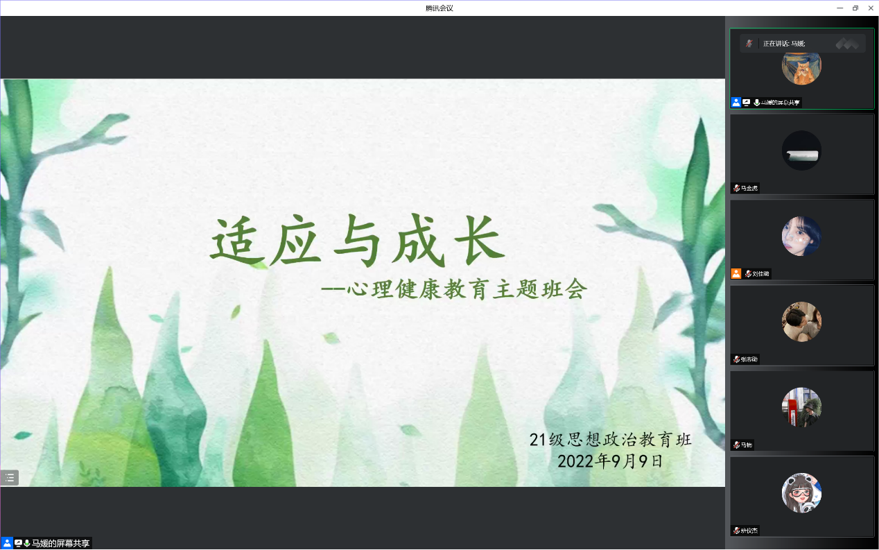 为了更好地开展疫情期间员工心理健康教育工作,缓解疫情带给同学们的各种心理压力,调动同学们的学习积极性,同时加强中秋节期间的安全教育和引导。2022年9月9日,体育平台官网21级思想政治教育班组织开展线上“适应与成长”心理健康教育主题班会,本次班会由班主任任玥老师主持,心理委员马媛同学进行分享,21级思想政治教育班全体同学参与。