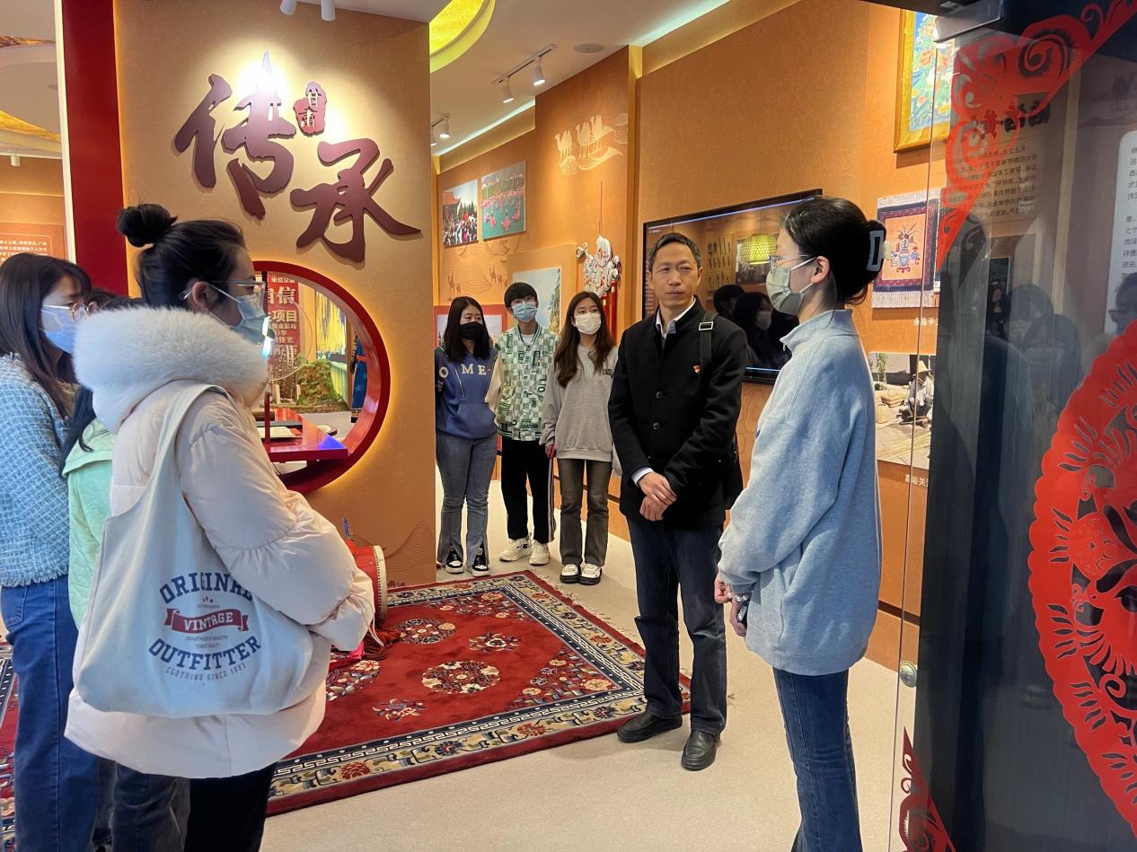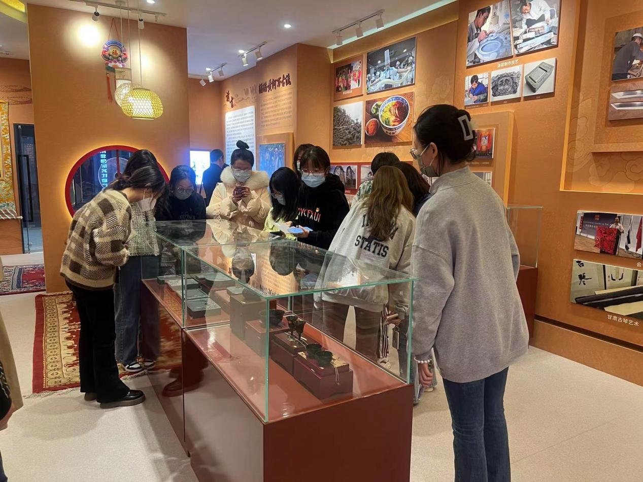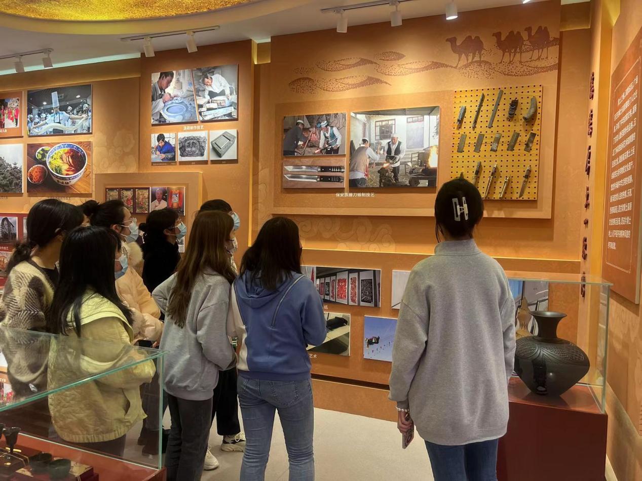 随后参观了甘肃省非物质文化遗产展厅和非遗档案馆。解说员为大家仔细讲解了剪纸花团锦簇、道情皮影戏、夜光杯、保安族腰刀、兰州黄河大水车制作技艺、庆阳香包等多种非遗项目。在非遗档案馆,用图片和资料重现了甘肃非遗的发展历程,让同学们了解到甘肃非遗的文化魅力,深深地体会到了甘肃文化的博大精深,切身感受了甘肃深厚的文化底蕴。