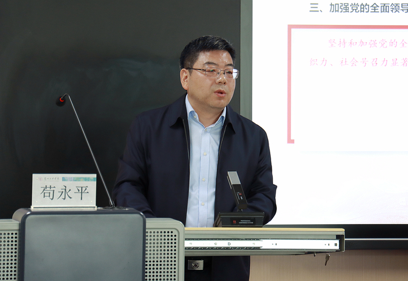 苟永平围绕“中国共产党的领导是中国特色社会主义最本质的特征”“坚持党对一切工作的领导”“健全和完善党的领导制度”等三方面展开讲授,从近代以来中国各阶级救亡图存的探索引入,阐述了坚持党的领导是近代以来历史的选择、人民的选择,也是我国宪法明确规定的;从理论优势、组织优势、自我革命等三方面阐述了中国共产党领导的优势所在;结合自身的工作实践和学习体会,详细讲解了党的全面领导的科学内涵,以及新时代伟大成就彰显的党的全面领导、党中央集中统一领导的制度优势,强调坚持党的领导是全党的责任,也是全国各族人民幸福所系。要实现党和国家的长治久安,就必须持续加强党的领导制度建设。勉励同学们要坚定不移听党话、跟党走,认真学习马克思主义经典著作与党的创新理论,深刻领悟“两个确立”的决定性意义,坚定“四个自信”,做到“两个维护”,自觉用习近平新时代中国特色社会主义思想凝心铸魂,做到学思践悟、学用结合。