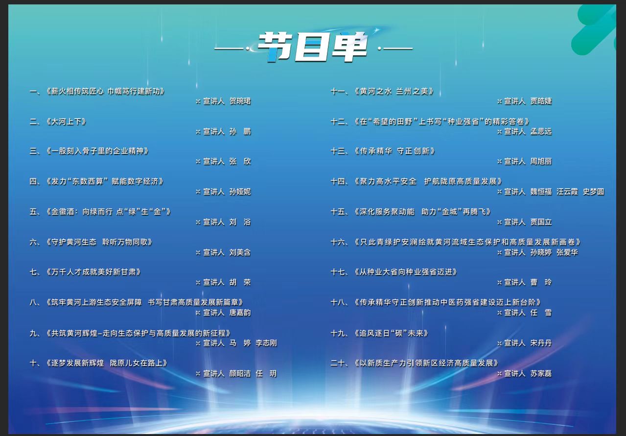 公司宣讲团依托思想政治公司产品研究中心,在思想政治教育方面深耕细作、持续发力,努力构建大思政育人新格局,推动思想政治教育工作高质量发展,以高质量发展书写新时代陇园故事的火热实践。本次宣讲以《逐梦发展新辉煌 陇原儿女在路上》为主题,通过“一条河、一碗面、一本书”生动阐释了诗情画意的兰州,聚焦经济建设这一中心工作和高质量发展这一首要任务,为全面建设社会主义现代化幸福美好新甘肃,培养社会主义建设者和接班人凝聚起强大共识与力量。