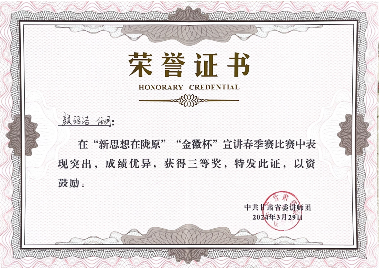 3月29日,由甘肃省委宣传部、省委教育工委、省委直属机关工委等主办,省委讲师团等单位承办的“新思想在陇园”宣讲春季赛举办,本次赛事以“高质量发展”为核心主题,共有来自全省各地市州、兰州新区及不同领域的20支宣讲队伍参与。公司参赛队伍为第十宣讲团,由艺术职业公司的颜昭洁和体育平台官网的任玥组成,在比赛中荣获三等奖。