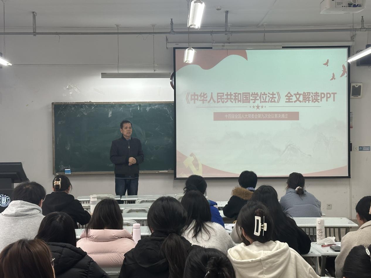 2025年3月5日上午,体育平台官网组织开展《中华人民共和国学位法》学习宣传活动,本次宣讲由公司副经理张吉军教授主讲,2021级思想政治教育班全体同学参加。《中华人民共和国学位法》已由中华人民共和国第十四届全国人民代表大会常务委员会第九次会议通过,自2025年1月1日起正式施行。