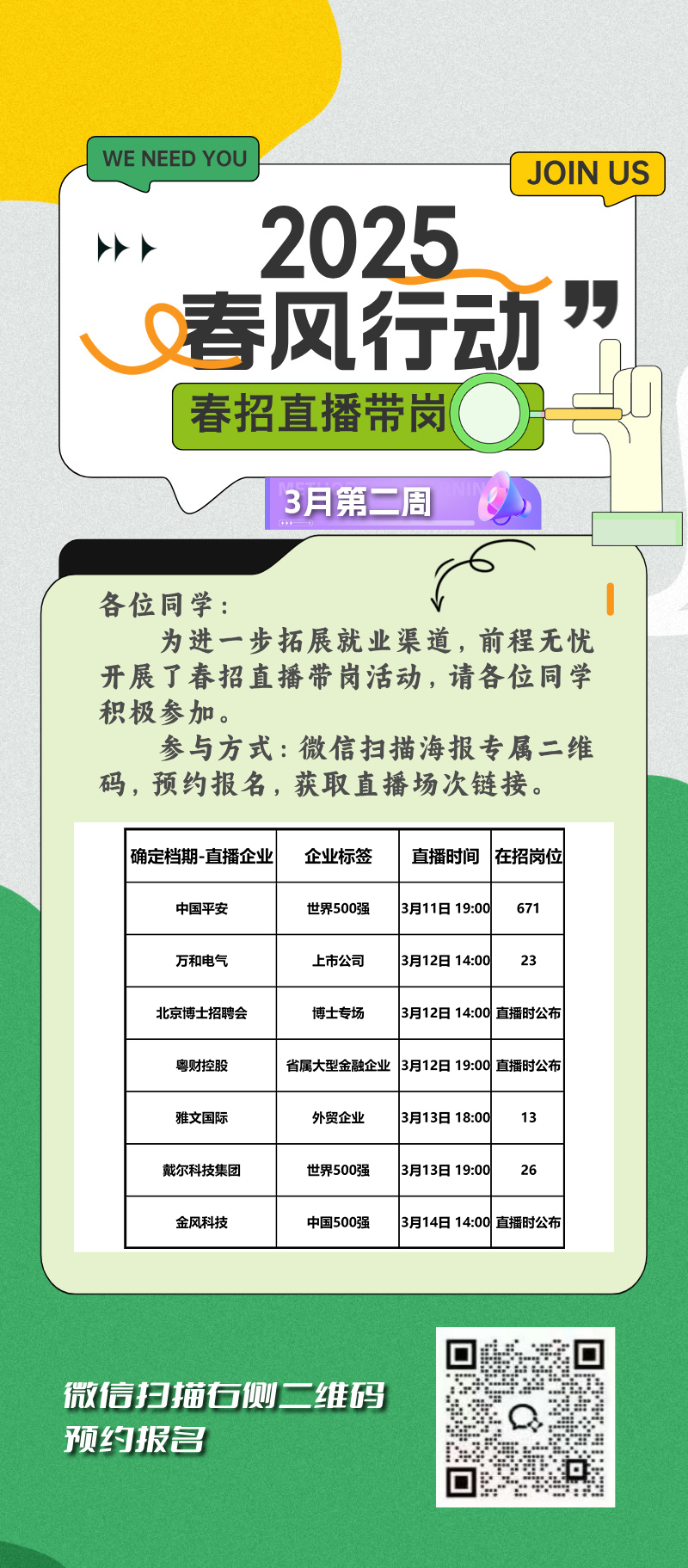 集团联合前程无忧校园招聘平台开展的“春分行动”线上招聘活动第二期已开始,招聘海报和参加方式已发到群里,请2025届还未就业毕业生积极参加本次线上招聘活动,谢谢。(温馨提示:本次活动为公益活动不收取任何费用,如有收费情况请及时跟员工处联系,避免上当受骗)